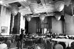 据透露,位于一楼的金莲宴会厅将成为当日婚宴的主宴会厅。记者在现场看到,整个大厅最多能容纳50桌宾客,昨日正在铺设桌子。金莲宴会厅貌似平常,但低调中难掩奢华,大厅上方的水晶吊灯据说价值达20万元以上,而大理石地板据说当年采用的也是顶级石材。
