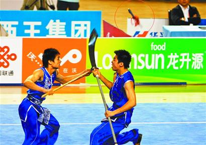 紧接着四川队又重蹈覆辙。他们表演的项目是双刀进枪,也就是一名队员持双刀与一名持长枪的队员进行对抗。他们断枪的过程更快,比赛刚开始没多久,长枪与双刀接触后,枪头突然飞了出去。这样,他们也没有了比赛成绩。