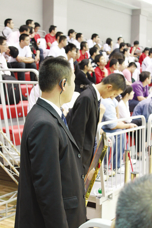 最终在三楼,记者看到了修葺一新的排球馆,不仅如此,更有近20位保安守在场边维持秩序,一旦有人试图进入场地,保安立刻上前进行阻止,这让记者不禁感叹:“国家队训练也没这个阵势来得大啊”。