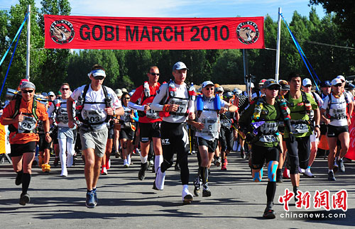 中新网乌鲁木齐6月27日电(记者 汪金生)第六届国际戈壁拉力赛(又名“戈壁长征”Gobi March)27日在新疆吐鄯善地区境内举办,来自美国、澳大利亚、法国、新西兰、中国香港等34个国家和地区的154名选手、15名志愿者,将利用一周左右的时间,徒步走完280公里的征程。