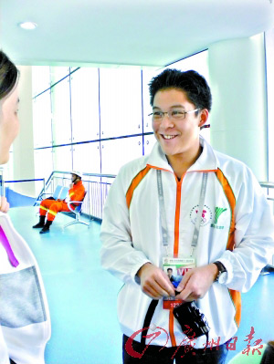 在十一运游泳比赛的第一天,赛场内的焦点是刘子歌、焦刘洋和张琳这3位世界冠军。比赛刚开始,看台上已经座无虚席。记者就坐在香港队队员旁边,就在男子 400米自由泳预赛开始时,香港队队员们纷纷拿出了数码相机,记者以为他们是要拍正在比赛的世界冠军张琳,但只见队员们轮流换座位,要求坐到一个帅气的男生身边与之合影。记者上前一看,这个“明星”胸前的VIP证件上写着“香港代表团霍启刚”。