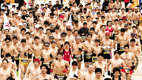 中新网1月5日电 据朝鲜日报中文网报道,4日上午,在韩国大邱举行的“第2届新年裸跑马拉松大会”上,参与者们不顾寒冷的天气,正在尽力向前进。