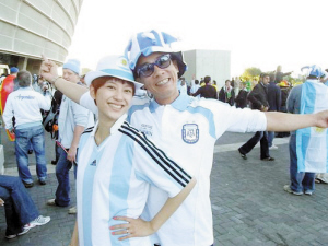 与为发泄不满就爆粗口或者热衷预测冠军的球迷不同,总有一部分人善于控制自己的情绪和内心。在南非球场的观众席上总能看到不少明星的身影,看台上的莱昂纳多·迪卡普里奥以及查理兹·塞隆仿佛是参加奥斯卡颁奖,一副气定神闲的神态丝毫不受场上比分的影响。与之相比,陈小春与老婆应采儿更是“盛装”出席比赛,为了表示对阿根廷的支持,二人都穿上了代表阿根廷队的蓝白色队服。对于最后失去了晋级机会的阿根廷队,陈小春则半开玩笑地表示,“是因为今天没唱《阿根廷别为我哭泣》。”(记者 谢云深)