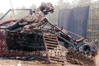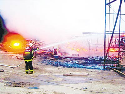 9日凌晨3时许,《赤壁》剧组在北京小汤山国家农业科技园内拍摄时发生火灾。目击者称,现场被烧毁的两艘仿古战船只剩下铁骨架,另有一艘约12米长的道具船船头损毁,场地上搭建的背景绿屏也烧毁了一大半。