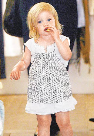 中新网6月26日电 “性感女神”安吉莉娜·茱莉与男友布拉德·皮特的亲生女儿希洛(Shiloh),去年在老爸的新片《班杰明的奇幻旅程》(The Curious Case of Benjamin Button)中亮相,该片预告最近在网络上曝光,希洛坐在爸爸腿上看气球飘走,短短两秒镜头吸引数万网友争睹,人气超旺。