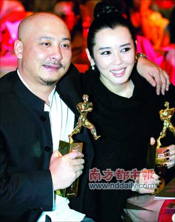 在领过最佳影片奖下台后,媒体要求王全安捧杯留影时,他并没有忘记坐在身边的余男,右手拿着奖杯,左手自然地搭在余男的肩上,两人淡定愉悦的面对闪烁的镜头。