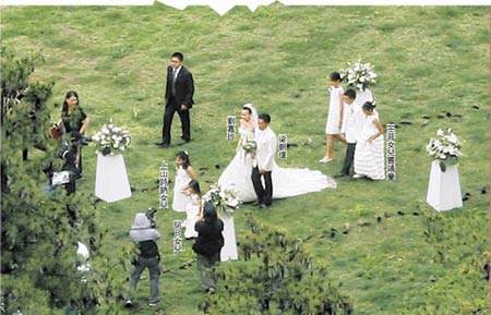 晚宴众星云集,但王菲的轻柔嗓音一传出马上成为焦点,虽不是唱婚礼上最常被歌颂的《我愿意》,但她不改酷样选唱邓丽君《甜蜜蜜》,歌声仍将新人甜蜜传达给众人,新郎、新娘、钟镇涛、张清芳也都开心高歌。