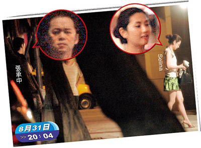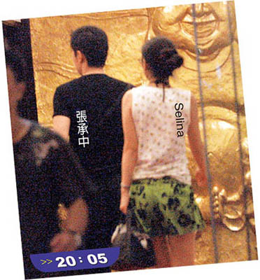八月三十一日晚间八点,张承中开着Selina的车来到台北市敦化南路上的“骥园川菜馆”,穿着短裙白背心的Selina则从副驾驶座下车,刻意低着头走进餐厅,而一身黑色休闲服的张承中,将车钥匙交给泊车小弟后,也跟着Selina走进餐厅,一路不停盯着远方看有无狗仔车,非常谨慎小心。