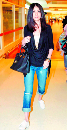 陈慧琳手提价值近8万港币的爱玛仕黑色皮手袋去台湾开工,她笑称:“这包有一半来自雷颂德的礼金。”