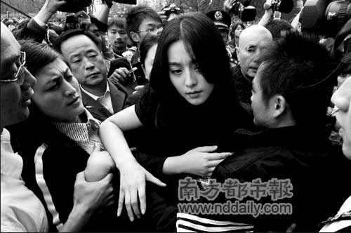 来为恩师送行的范冰冰、赵薇就没有那么幸运。据说,两人原本打算从正门进入,却接到提前到达的电影局副局长江平的电话,安排两人改从地下停车场或者侧门进入。等范冰冰到了侧门,发现人比正门还多,只好又绕到正门进入。有记者撰文称:“范冰冰先是被人群冲散,不得已而走了正门,冲过重重人群进入大厅,她的脸被挤得几乎变形,表情也极度痛苦。经纪人和司机为了保护她,差点和围观的拍照者打了起来,范冰冰见状忙大叫,‘不要打了!’”