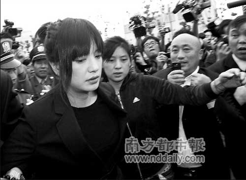 “随后到达现场的赵薇声势更为可观。自打她的银色座驾进到龙华殡仪馆就开始举步维艰,到了大厅入场口,更是被人群围得寸步难行。……车子好长时间才挪动了几米。……围观群众实在太多,阻挡住赵薇送别恩师的路。记者注意到,她鬓发齐乱,神情无奈而狼狈。”