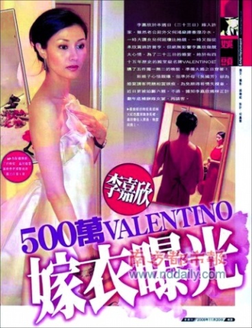 本报讯 (见习记者 陆欣)李嘉欣500万嫁衣曝光?昨日,最新一期《一周刊》以“500万Valentino嫁衣曝光”为题报道,称李嘉欣为婚礼专门订做了5件高级晚装,总价值高达500万元!另据香港媒体报道,因自己的豪门婚事备受外界质疑,传闻颇多,准新娘李嘉欣在上海接受媒体采访时,一一作出了回应:不得未来公婆喜爱?“(他们)送了好大惊喜给我”;许晋亨被前岳丈暗批?“我们(指她与何超琼)是好朋友”等,而被传出与旧爱大刘抢风头,她表示新闻相撞纯属巧合,并透露大刘已送厚礼。