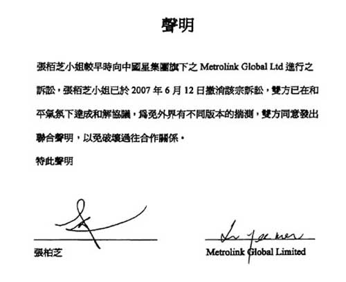 中新网8月3日电 香港明报报道,张柏芝今年5月17日入禀法院,向中国星旗下的Metrolink Global Ltd追讨1588万元欠薪,令一向视她为女儿的中国星负责人向华强太太极为愤怒,并表示奉陪到底。未知中国星是否贺柏芝为人母,昨日发表声明,指柏芝已于2007年6月12日撤销诉讼,双方在和平气氛下达成和解协议;为免外界有不同版本的揣测,双方同意发出联合声明,以免破坏合作关系。