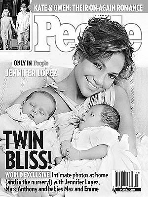 早在洛佩兹2月22日在纽约长岛产下龙凤胎之前,《人物》杂志已抢先和洛佩兹达成合作,以600万美元的价格取得首张婴儿照的独家发布权。本周五发行的《人物》杂志以12页的篇幅刊登了洛佩兹和歌星丈夫马克·安东尼以及快满月的小宝宝在长岛家中的温馨全家福。在报道中,洛佩兹和安东尼向杂志倾吐了十月怀胎以及初为人父母的种种感受,从洛佩兹的体重增加到回应外传她靠人工授精的报道。杂志主管编辑拉里·哈克特说:“这正是读者期待从我们杂志上所能看到的大明星们既美丽又私密的照片。”