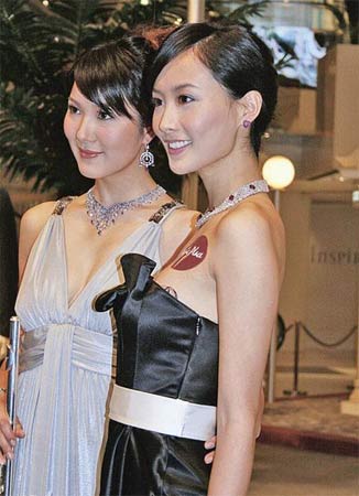 陈法拉(右)昨日参与时装珠宝秀演出,不慎外露隐形内衣。香港明报图。