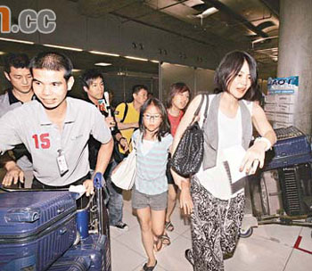 记者注意到,王菲夫妇此行,共带了6大箱行李,走出机场后,李亚鹏很快看到前来接待他们的小面包车,又朝着王菲大喊一声:“老婆,快点!”