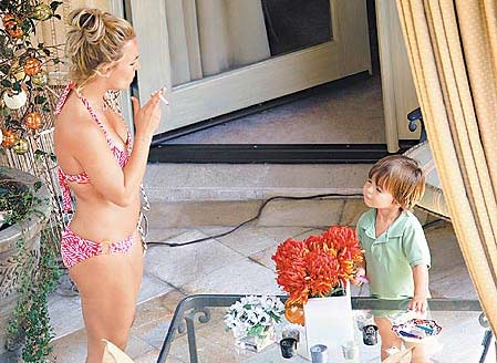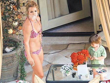 中新网7月22日电 “小甜甜”布兰妮(Britney Spears)行使探视权和儿子见面,却被拍到穿着比基尼在将满3岁的大儿子西恩(Sean Preston)面前吞云吐雾,难怪在争夺两个儿子监护权的官司中输给前夫凯文费德林(Kevin Federline)。