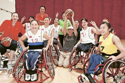 刘德华为轮椅女篮球队队员打气。