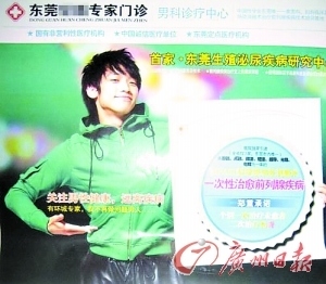 不管刘德华是否愿意,远在香港的他确实成为了东莞某诊所医疗广告的封面人物,他这次代言的广告不再是名车、名表或者是名洗发香波,而是治疗前列腺炎。