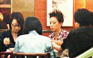 林忆莲(右二)与工作人员用餐,表情严肃。