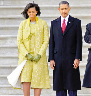 新任美国总统奥巴马的妻子米歇尔在典礼上的穿着,时尚界评价不一,设计师托雷多说,黄色并非政治场合的传统颜色,不过它传达了希望与乐观的意象。托雷多说,她是用瑞士羊毛蕾斯混法国丝的布料,裁制那套衣服,黄色代表阳光。