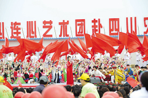 前天上午,为了让更多的灾区人民以及援建志愿者看到演出,“心连心”艺术团专门派出两支小分队赴德阳东汽新址以及北川擂鼓镇举行分会场表演,而昨天上午,主会场的演出则在绵竹上演,上万观众观看了演出。而央视著名主持人赵忠祥、毕福剑、徐俐、韩乔生、李瑞英、王小丫、鞠萍、马东、朱迅等名嘴担纲主持并反串了精彩节目。孙悦、韩磊、汤灿、张迈、陈小涛等近百位明星为灾区群众献艺。这样的阵容的确如之前报道的一样,“超过春晚”。许多灾区群众感动地说:“央视心连心艺术团,在地震周年到灾区演出,确实把温暖送到了我们心里,让我们对重建家园更有信心”。