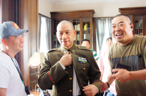 昨天上午,刚刚从上海赶到天津的王学圻直奔《建国大业》在河北区梁启超饮冰室搭建的片场,拍摄“李宗仁会见司徒雷登”一场戏,饮冰室内部的阁楼布置成司徒雷登的办公室。和导演黄建新做了简单的沟通后,王学圻和扮演司徒雷登的演员开始试拍。在监视器中,身着国民党军装的王学圻老成干练、威风凛凛,这场戏是李宗仁以私人身份要求获得杜鲁门政府的支持,却遭到了拒绝。王学圻表现得不卑不亢,将焦点转移到了扮演司徒雷登的非职业演员身上,导演黄建新告诉记者,这位扮演司徒雷登的演员本是在中国发展的美国商人,一次偶然的机会让他加盟剧组,到目前为止的表演令人很满意。而在实力悬殊的对阵中,“司徒雷登”却显得有些紧张,有两次还说错了台词,稍加稳定之后,最后一条终于通过。黄建新导演高兴地告诉和王学圻拥抱一起的“司徒雷登”,“这是天津的记者,你们快拍一张合影,这样你就上报纸啦!”