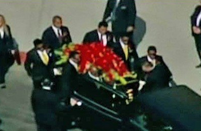 中新网7月8日电 迈克尔.杰克逊的遗体正在从墓园运送到公众追思会斯台普斯中心途中。装运杰克逊遗体的棺木上面放满了红色的玫瑰花。