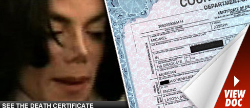 在这份注明2009年7月7日开立的死亡证明书写着,黑人男性,死者全名为麦可尔‧约瑟夫‧杰克逊(Michael Joseph Jackson),生于1958年8月29日,死于2009年6月25日,终年50岁。
