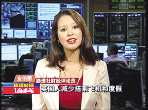 这位集美貌与智慧于一身的知性美女来自路透社,她叫金伯丽,广大观众在一饱眼福的同时,通过她与主持人芮成钢的现场连线,还能了解最新财经动向。