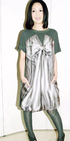 LS点评:婚后的杨千嬅继续亲和路线,松身剪裁的拼接连衣裙让你完全不会care她并不火辣的身材,但蝴蝶结形的抹胸设计也让她多了一点小小的妩媚和性感。
