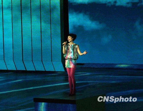 2009款银河系丝缎礼裙,王菲的搭配比模特加了腰带和丝袜,显身材。当天的舞台有蓝色的宇宙背景,王菲的造型显得空灵静谧。但也有网友不买账更指发型老土。