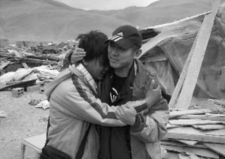 在被震毁的孤儿院前,李连杰拥抱着孤儿院的副院长