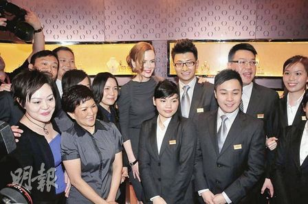 妮可与专卖店的职员搭肩头合照,非常亲切