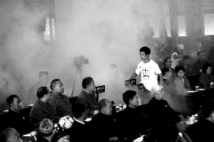 11时许,委员们携手走进了基地内仿制的“中南海怀仁堂”,这里的道具都是模仿当年的真实场景设置,包括桌上的水杯、文件封面。迈进“会场”,大家表情严肃了许多,已连续3届当选政协委员的徐定茂回忆,自己第一次走进人民大会堂履职时,心情也非常激动,“第一届会议具有特殊意义,可想当年委员们的心情。”在导演的指挥下,委员们落座,投入“默哀”、“选举”等场景的拍摄中。记者傅沙沙