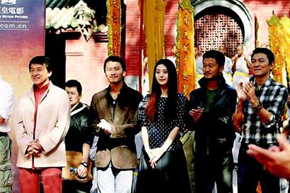 昨日现场,在成龙、刘德华、谢霆锋、范冰冰等明星悉数亮相后,现场的嘉宾和武校的学生们都纷纷围上去想和偶像近距离接触,场面一度失控。成龙一出场就发挥他的“大哥”本色,呼吁现场人士维持秩序,而刘德华也呼吁大家小心安全。《新少林寺》在今年初就已经开始筹备,在确定了成龙、刘德华二位影坛巨星加盟之后,女主角却迟迟定不下来。曾经一度传出张柏芝、周迅等多位一线女星争相加盟,竞争异常激烈。昨日范冰冰的出现,结束了女主角的悬念。