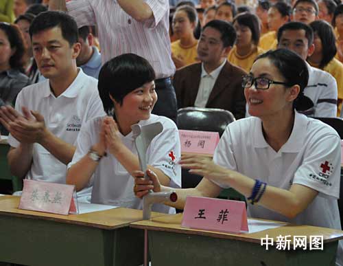 五月十一日上午,由王菲、李亚鹏夫妇等护送的三位灾区孩子返回北川家乡,这是“汶川新家庭”助养计划的第一批孩子。图为王菲、李亚鹏夫妇和他们救助的北川中学学生朱春燕(右)合影。 中新社发 唐伟杰 摄