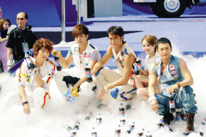 烈日炎炎阻挡不了粉丝的脚步,其中SJ-M的粉丝最为活跃,在他们振聋发聩的尖叫声中,09年“百事”形象代言人古天乐、罗志祥、蔡依林、李俊基、黄晓明、Super junior-m以载歌载舞回应粉丝热情。