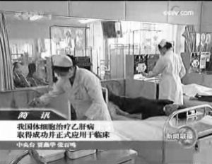 5月2日,央视新闻联播国内简讯中播报《我国体细胞治疗乙肝病取得成功并正式应用于临床》的新闻,其中称,“我国体细胞治疗乙肝病取得成功并正式应用于临床,一项采用体细胞治疗乙肝的新技术近日在解放军第261医院研究成功并正式应用于临床。该技术通过少量提取患者细胞后经过体外培养,再输回到患者体内激活免疫杀伤细胞,以达到杀灭血液及肝细胞内的病毒”。