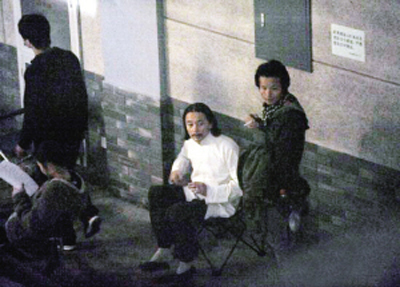 随后,廖凡、邵兵、张默一一亮相,他们都准备化妆拍戏,廖凡和张默留着锅盖头,一看似乎就是下级土匪,而邵兵留着平头和两撇细细的小胡子,看上去可能是一个“中队长”式的角色。虽然廖凡也留着小胡子,但他的胡子却显出一股“凶气”。