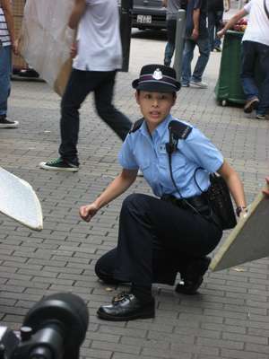 中新网7月3日电 据香港大公报报道,胡杏儿昨日为时装版《我的野蛮奶奶》拍外景,身穿女警制服的杏儿,为了帮一个小妹妹追回公仔,实时变身女成龙,既要跳过手推车,又要飞身擦地穿过一幅大画,更要在载人单车上凌空侧手翻,不过这一切都是女替身代劳,杏儿只是补拍几个近镜及一些简单动作。但由于天气炎热,拍起来也是十分辛苦。