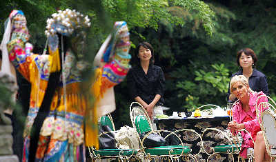 莎姐昨日原本计划10点到雍福会接受国际媒体采访并观看京剧,结果推迟了一个小时才到达。到达雍福会后第一件事并不是接受采访,而是拿起随身带来的相机到处拍照,最喜欢拍的是花花草草。之后,莎姐进入雍福会招待VIP的密训堂,选择此处为自己拍广告照。下午3点,主办方知道莎姐喜欢中国文化,特别安排她观看传统京剧《贵妃醉酒》。从没看过京剧的莎姐非常好奇,又拿起相机拍个不停,还不断询问工作人员演员在唱什么。后来干脆放下相机仔细聆听演员的演唱,到最后经典的京剧唱段时,竟感动得落泪。据悉,这次主办方请来曾为京剧大师梅兰芳拉琴的82岁高龄琴师顾永湘演出。演出结束后,莎姐还和戏社的演员亲密合影留念。