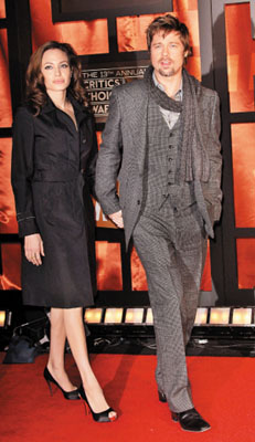 1月7日,茱莉和皮特出席影评人选择奖时,出人意料没有穿性感晚装出场,有遮掩凸起小腹之嫌。
