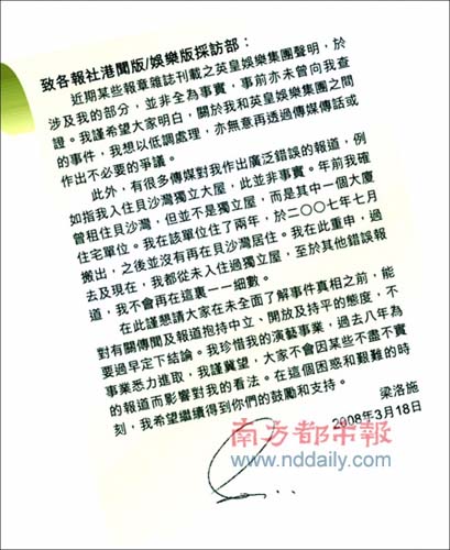 梁洛施早前被传恋上“小超人”李泽楷,还有消息称有人出一亿元为她赎身跟英皇解约,报道刊出后女方一直回避传媒,直至前晚终打破沉默发表声明,但内容并没有交代恋情。