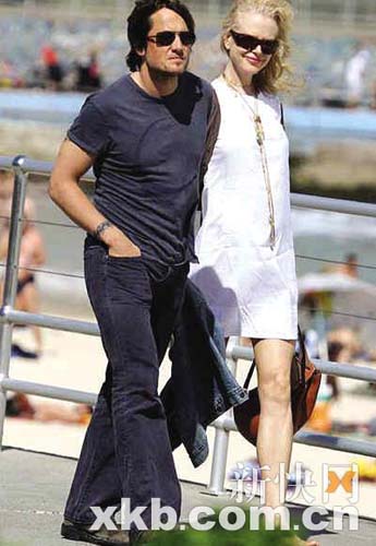 妮可·基德曼与丈夫基思·厄本携手漫步沙滩,腹部高隆,孕味十足。