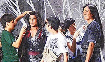 中新网4月22日电 电影《风云II》在曼谷试拍2周,昨正式开镜,郑伊健(饰聂风)、郭富城(饰步惊云)一开打就打破头,只见聂风拿刀朝步惊云的头砍去,步惊云来不及闪,刀便敲上他的脑门,当下郭富城捂住左额头痛苦不已,虽没血流如注,但他额头已肿如乒乓球大,他搞笑说:“没关系啦,就算我为迎接奥运,额头多个乒乓球。”