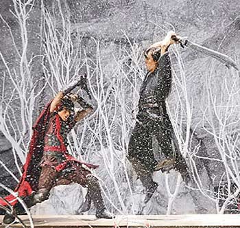 昨郑伊健(右)、郭富城在千万打造的布景中展开暴雪厮杀。