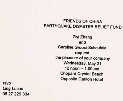 章子怡昨在戛纳Tod's派对上广发赈灾活动邀请卡(下图)。