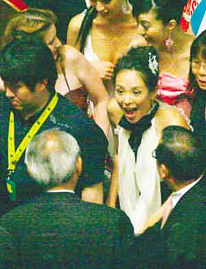 此后章子怡又看到两位熟悉的外籍电影人,马上张大嘴表情夸张地与对方“沟通”,并再度用章式贴面礼给对方一个问候。 (刘嵩)