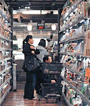 伏明霞产后变身家庭主妇,梁锦松蹲在地上帮老婆挑选商品。